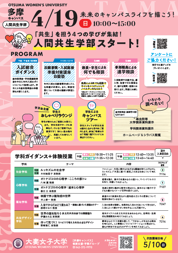 4月19日(日)に多摩キャンパスにて、人間共生学部のオープンキャンパスを開催します。